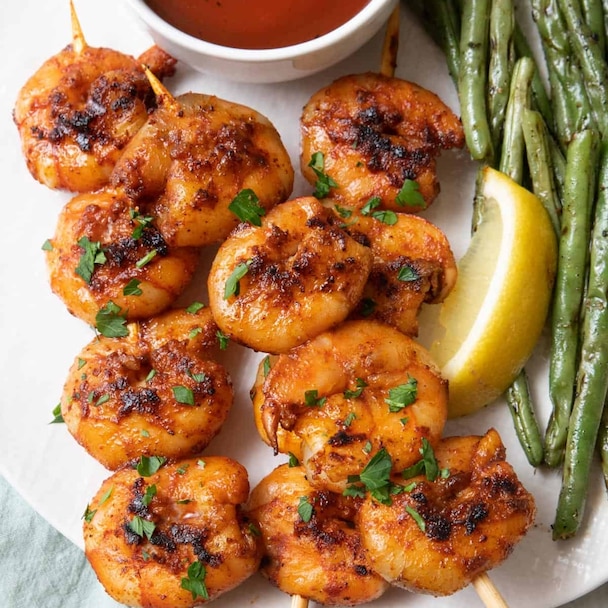 Coat each skewer with a touch of cooking spray, then grill until the shrimp are opaque white all the way through, 2 to 3 minutes on each side. You want some good charring on both sides, but don't overcook the shrimp.