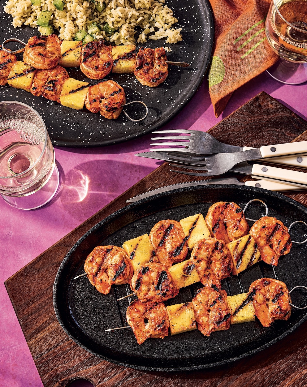 "The iconic Mexican flavors of 'al pastor' come together to flavor these shrimp and pineapple skewers," Meehan writes. "The intensely flavorful marinade, after a brief stint flavoring the shrimp, gets boiled to become a finishing glaze for the dish. Given the amount of acid from the pineapple and the lime, be sure not to let the shrimp marinate too long or they’ll get mushy on you."