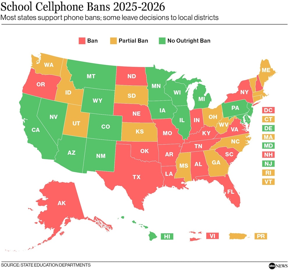 While many states have at least partially banned cellphones in the classroom this back-to-school season, some are still leaving those decisions to their local education agencies, according to a new data analysis conducted by ABC News.