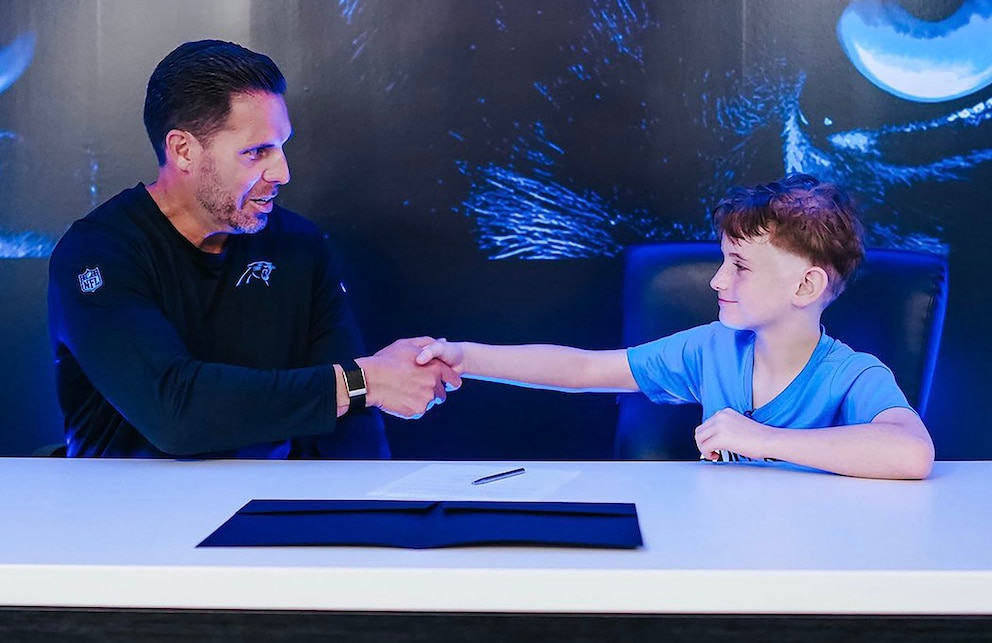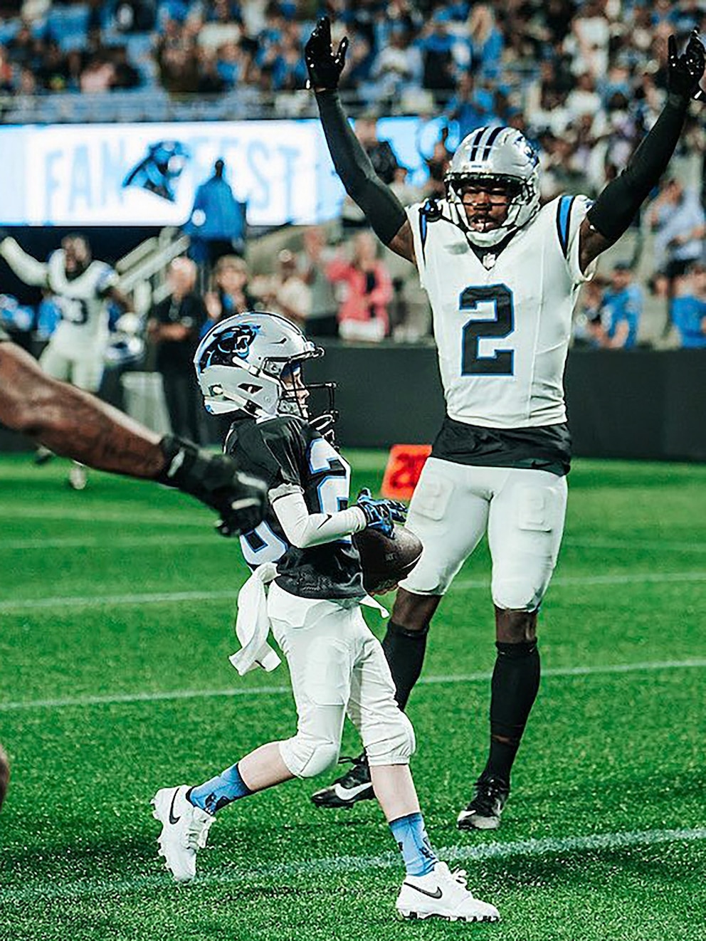 In the team gym, the 12-year-old lifted weights and even hung out with the Panthers' star quarterback Bryce Young.
