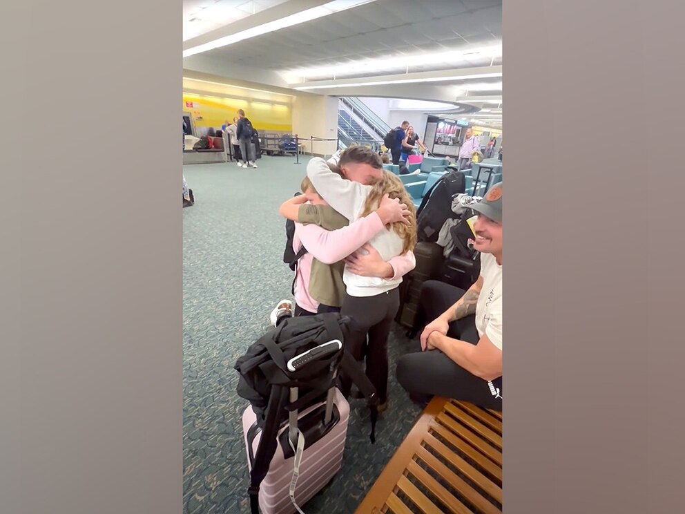 In the short video, which has already racked up more than 1 million views, Garrett's younger kids are seen sharing a conversation when their older brother walks up without them noticing and picks one of them up from their perch on the airport floor. He then gestures for his sister to join the hug, and the three siblings share a long embrace.