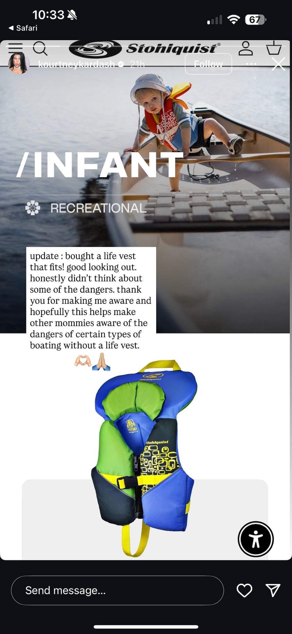 A day after the post, Kardashian Barker responded to the feedback, writing over a screenshot of a baby life vest: "Update: bought a life vest that fits!"