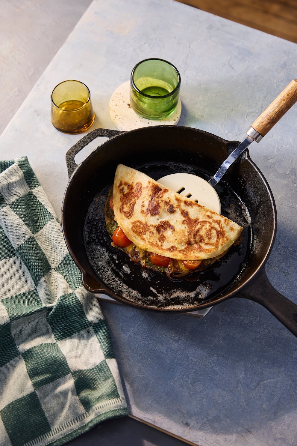 Spread a large spoonful of pesto on half of each tortilla. Add the shallots, tomatoes, and cheddar on top, then fold the other half of the tortilla over. Melt the remaining 1 tablespoon butter in the skillet. Cook the quesadillas one at a time, about 3 minutes per side, until both sides are browned. Cut in half and serve.