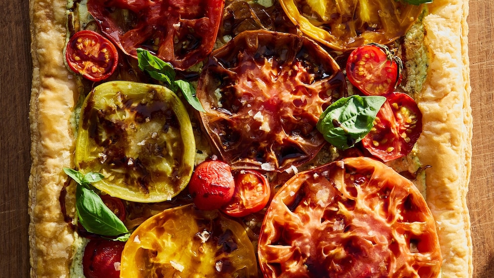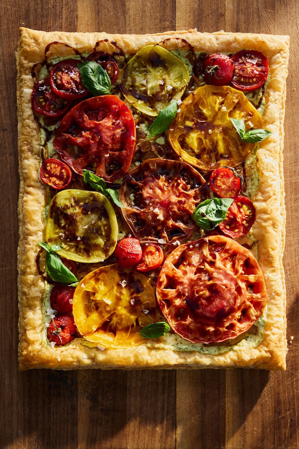 Spread the ricotta mixture over the puff pastry, leaving a 1/2-inch border. Add the caramelized onions on top, then layer on the tomatoes.
