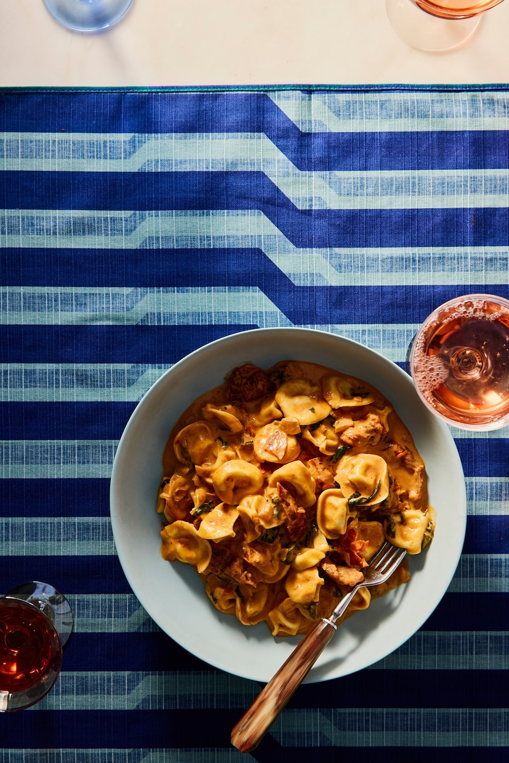 Add the sun-dried tomatoes, broth, and heavy cream. Bring to a boil, then reduce heat to medium. Add the tortellini and cook until tender, about 10 minutes.