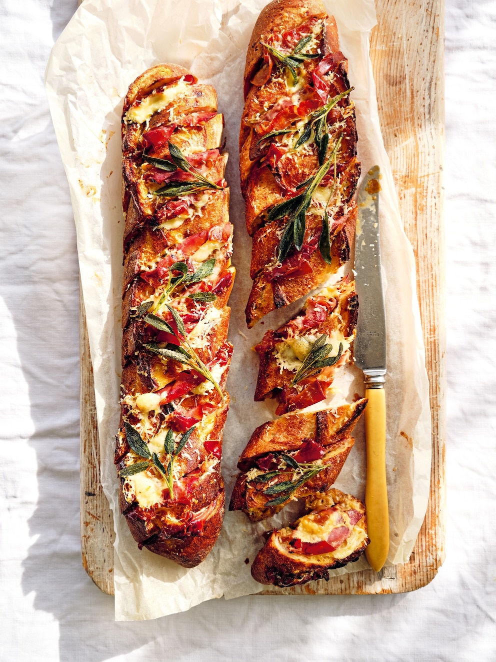 Spread the butter mixture between each slice, followed by the onion relish, then insert the prosciutto, gruyère and sage leaves in. Sprinkle with the extra sage leaves.