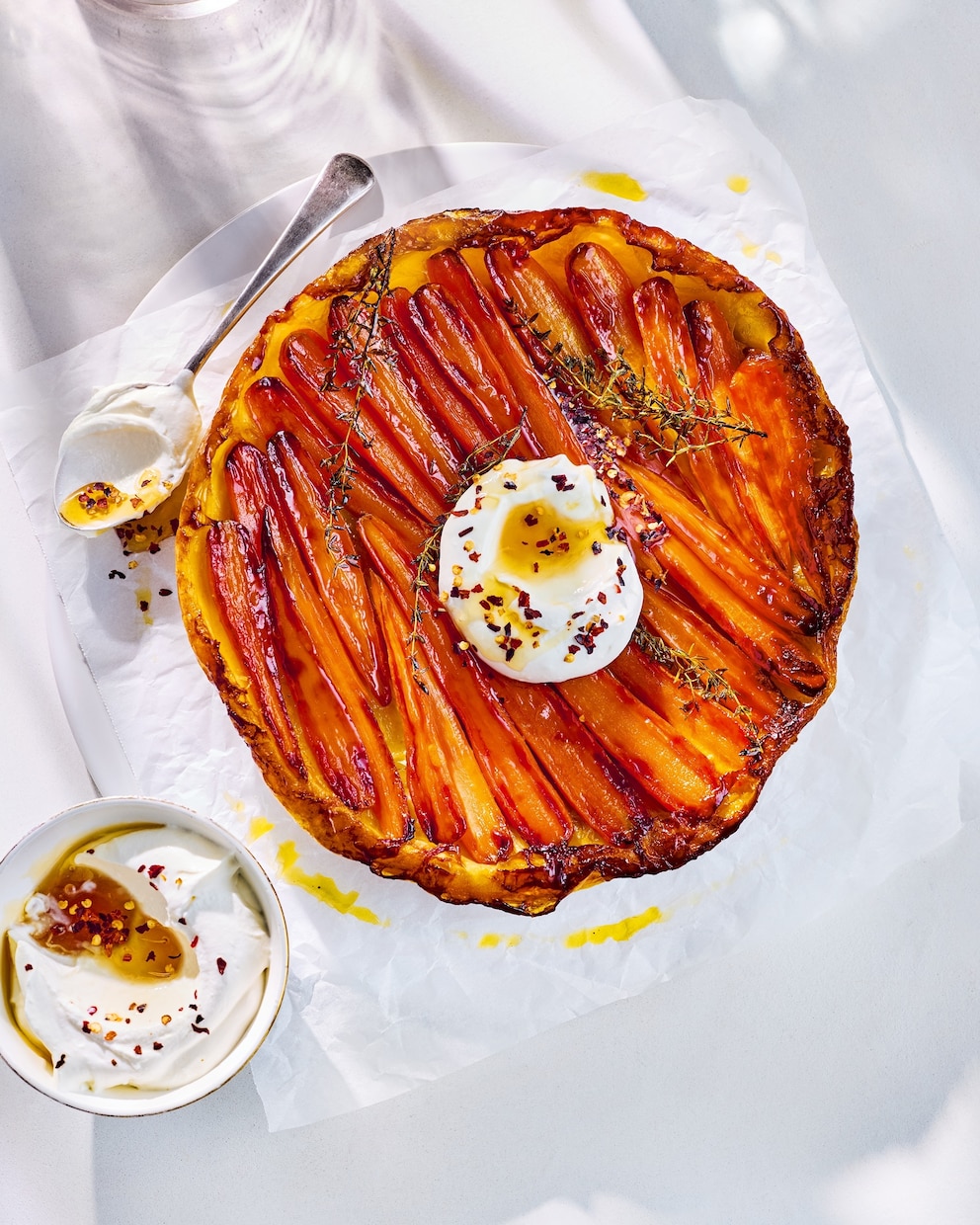 "Sweet, salty and buttery, this has all the classic flavours of a savoury tart, with some cooling creaminess from the whipped feta," Hay writes. "I love the drizzle of chilli-spiked honey for a final flavour lift."