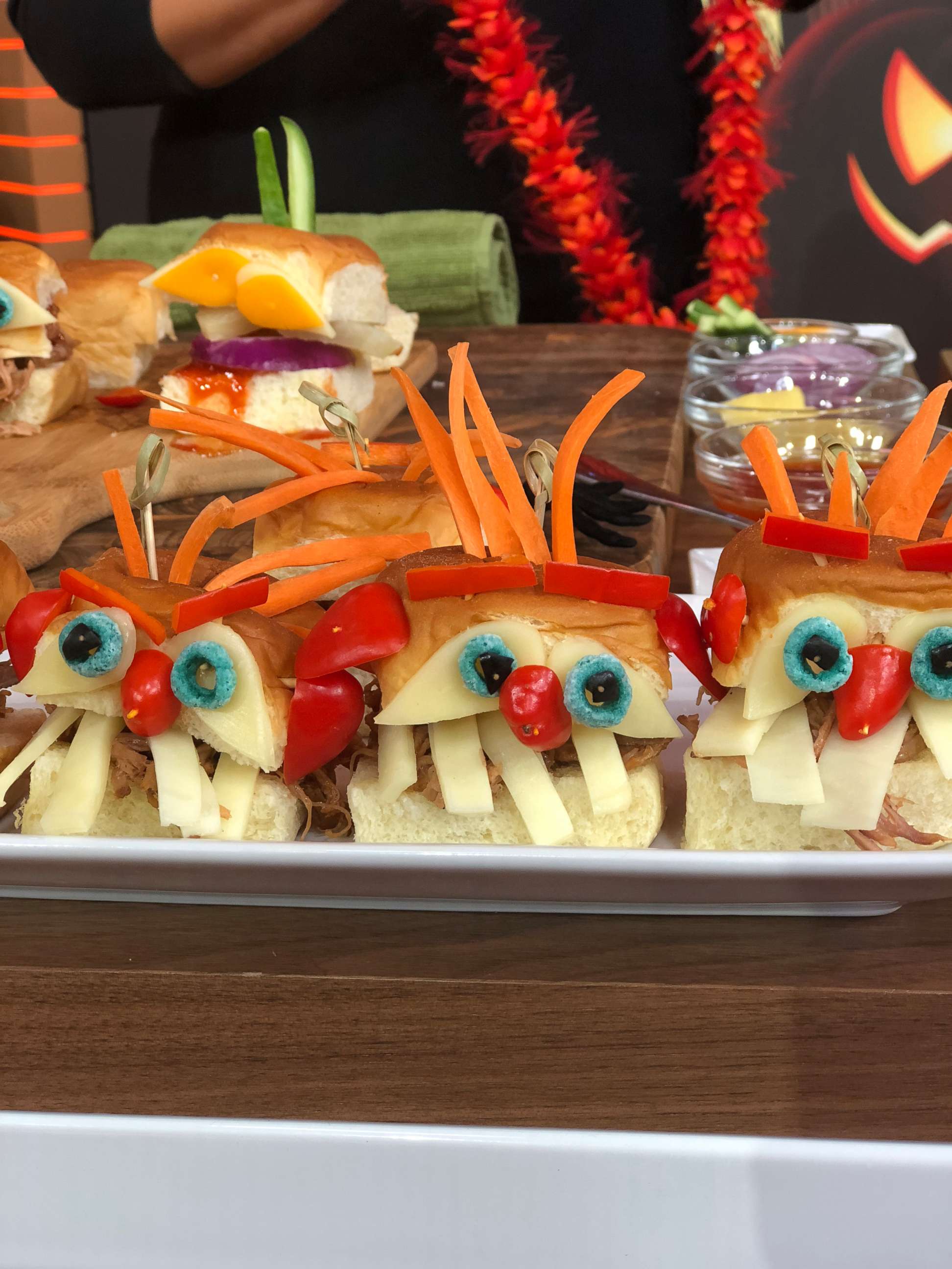Slice an inch-long slit across the top half of each roll to place “hair” into. Place on top off the pulled pork, creating a slider.