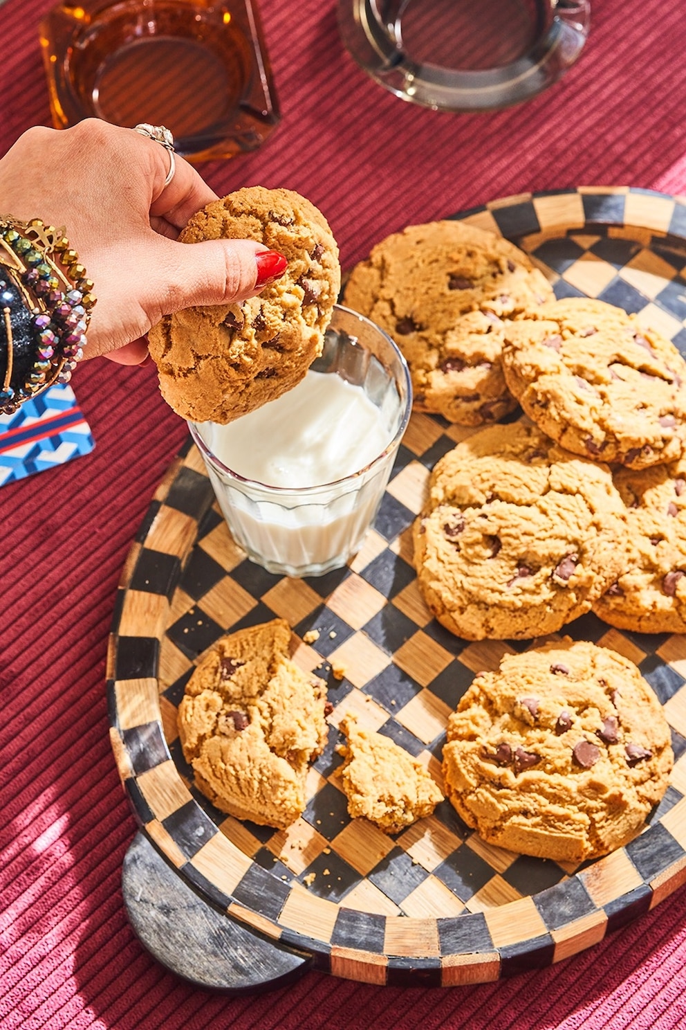 To warm: Arrange half of the cookies on a parchment-lined baking sheet and slide into a 300 F oven for 5 minutes. (As always, ask your host if you can borrow a baking sheet, parchment and oven space ahead of time!) Serve those cookies with tall glasses of cold milk for dunking, then warm up the second half.
