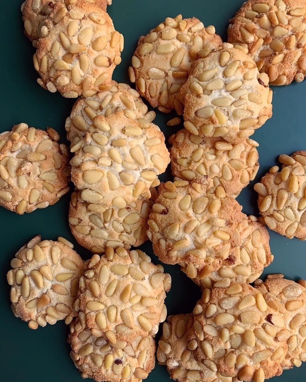 Pour the pine nuts into a small bowl. Scoop up 1 tablespoon of dough, roll into a ball, then roll through the pine nuts, pressing to adhere. Set on the prepared sheet pans. Repeat with the remaining dough, spacing them 1 inch apart.