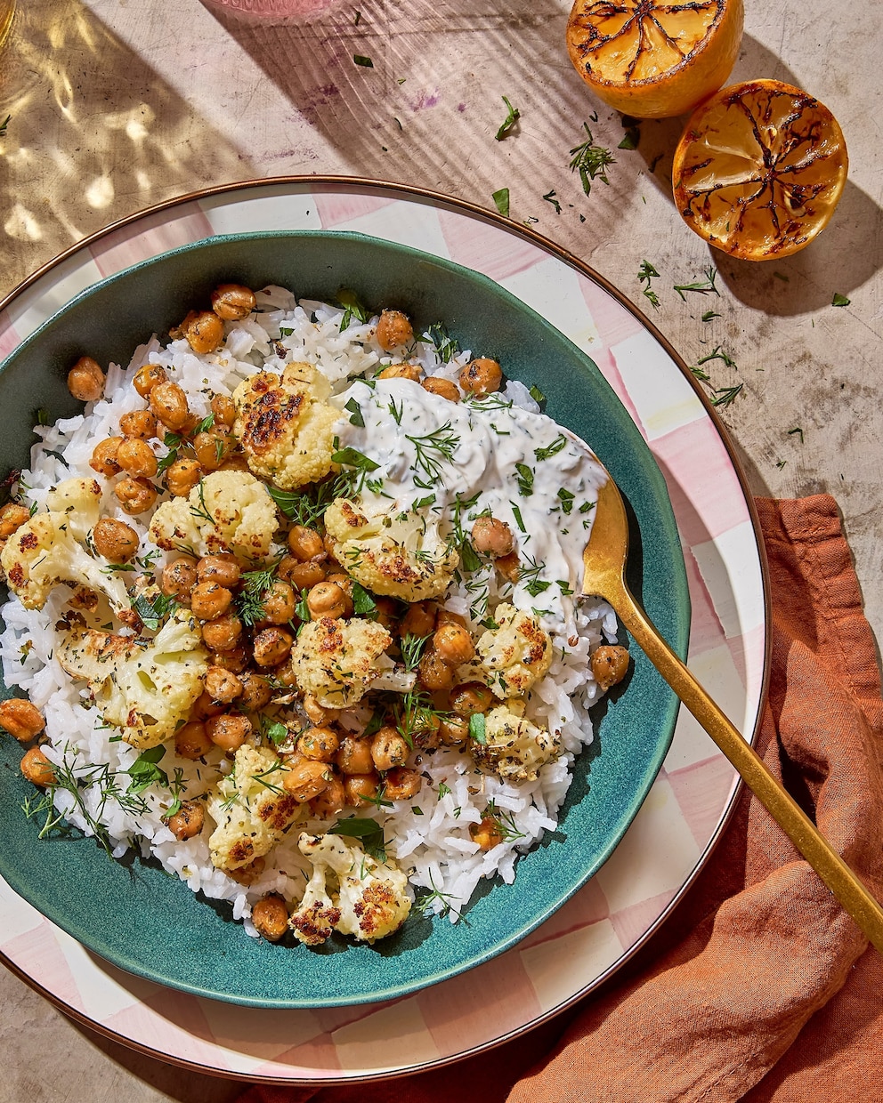 Assemble the bowls: Divide the rice among four bowls and top with the cauliflower and chickpeas. Drizzle with the lemon-dill sauce and garnish with fresh parsley and dill.