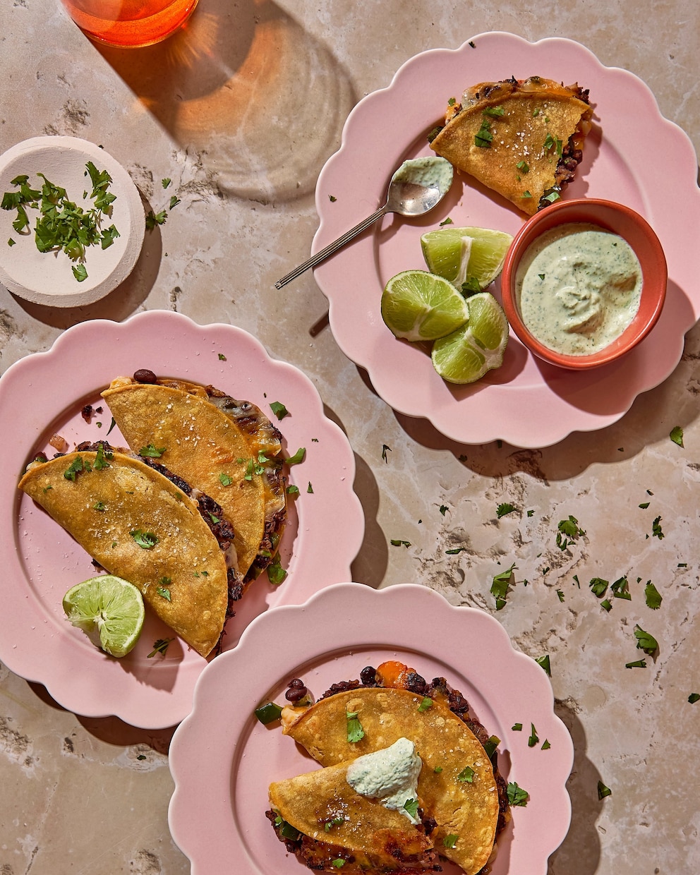 Assemble and bake the tacos: Wrap the stack of tortillas in one or two damp paper towels and microwave until softened and pliable, about 1 minute. Remove the tortillas from the towel and place them on the prepared sheet pans, flipping to lightly coat each side. Add 2 heaping tablespoons of the bean mixture to the center of each tortilla and spread with the back of a spoon, leaving a half-inch border. Top the tortillas with 2 tablespoons of the cheddar. Fold each tortilla in half, gently pressing down with a spatula to seal.