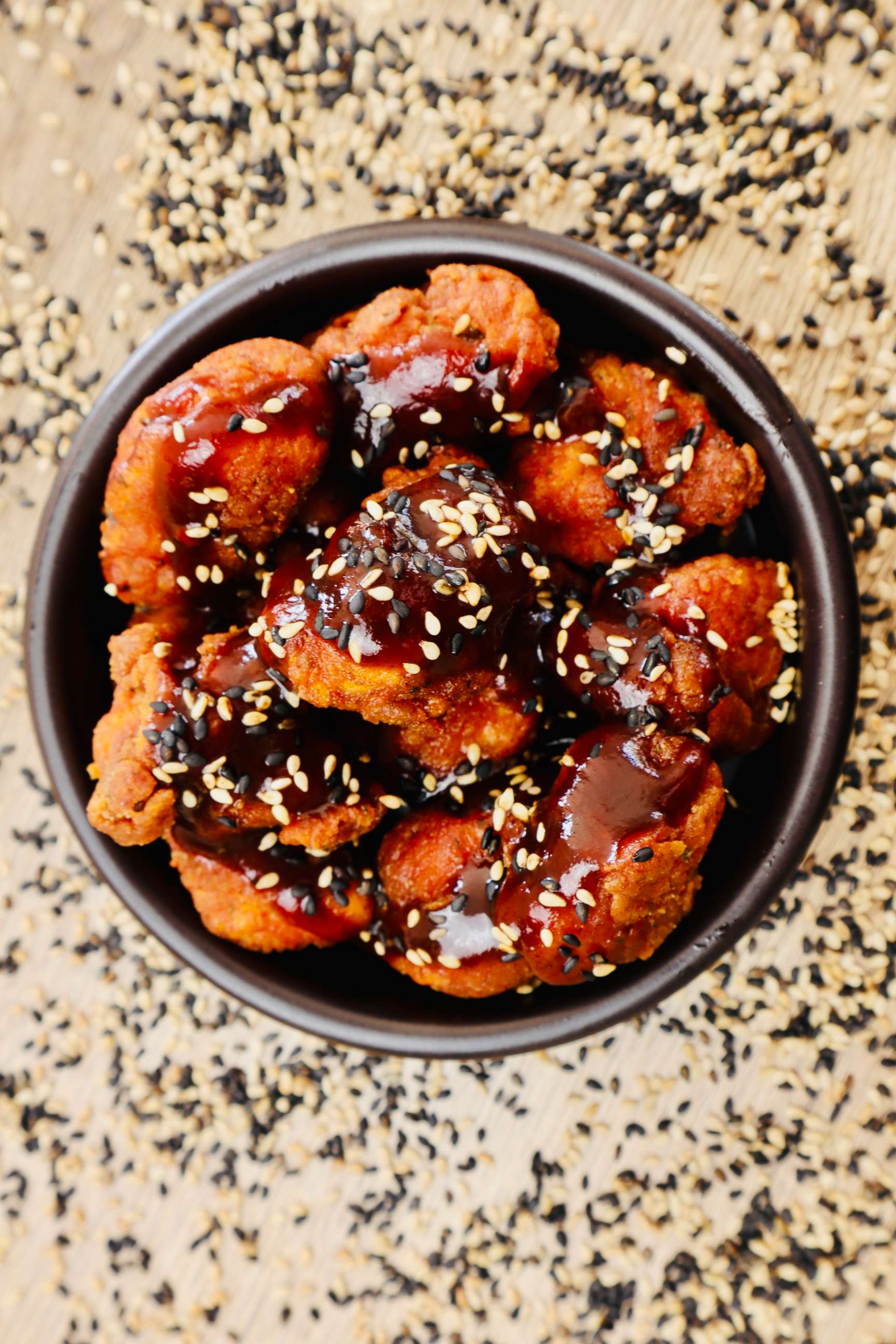Fry the chicken in vegetable oil for 4 - 5 mins @325F. Cover the chicken in the cola sauce (optional).