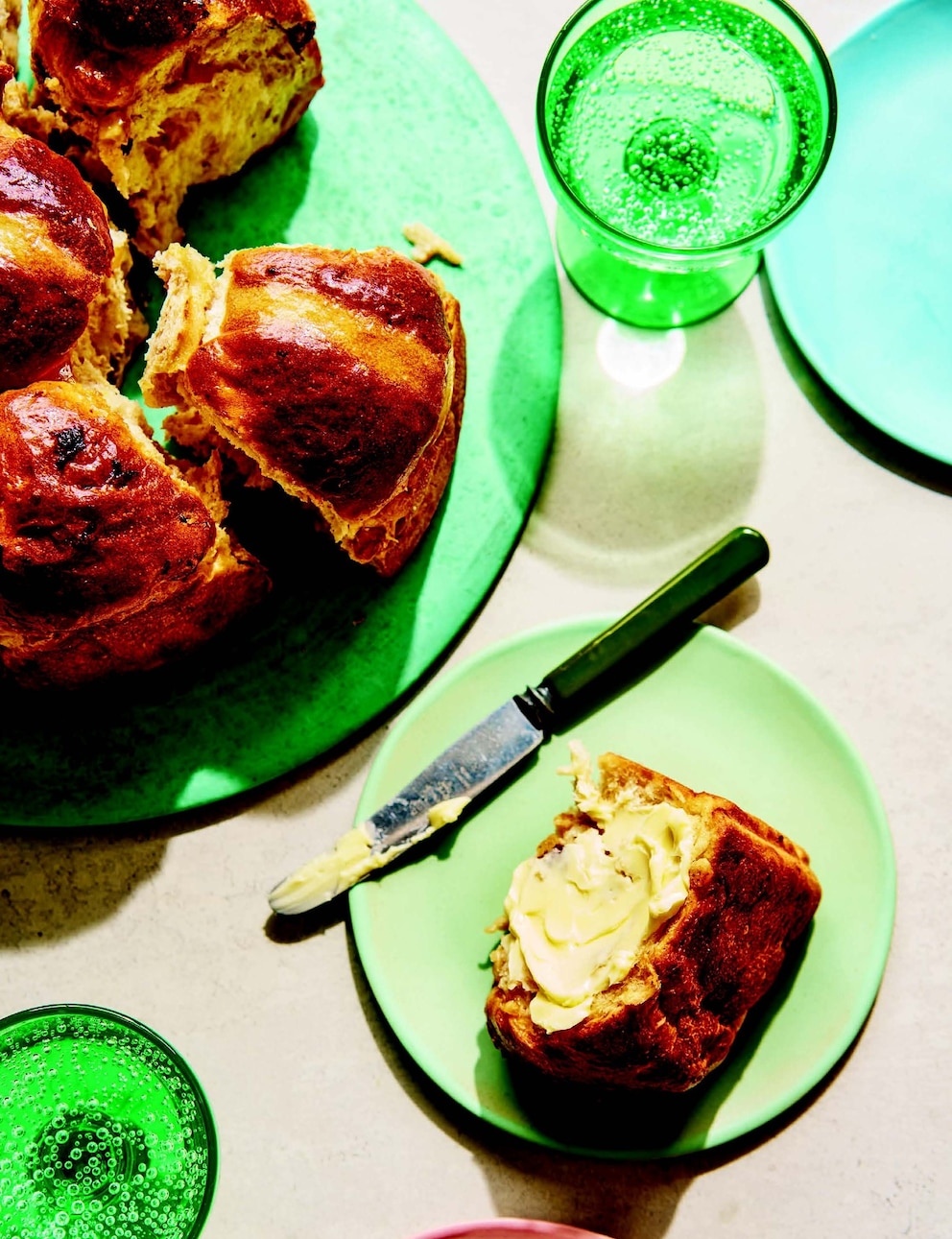 As you take the hot cross bun loaf out of the oven, brush the surface with the sugar syrup to glaze. Transfer to a wire rack and leave to cool completely before serving, with butter for spreading.