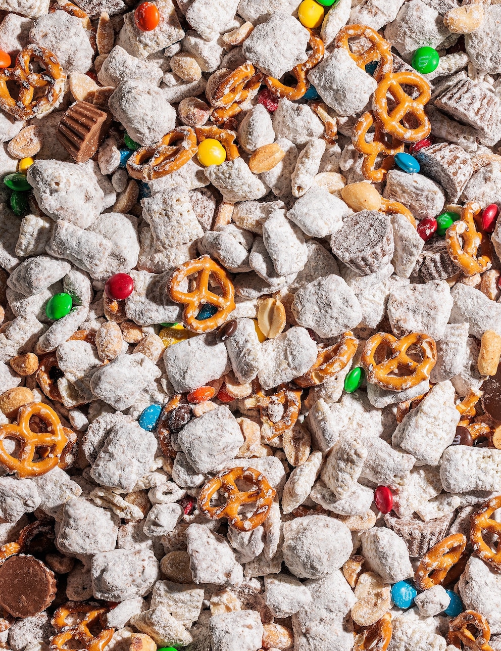 In a large bowl, combine the prepared puppy chow, mini peanut butter cups, mini pretzels, salted peanuts, and mini M&M's. I like to place another large bowl, upside down, on top and give it a vigorous shake, to ensure everything is evenly mixed.