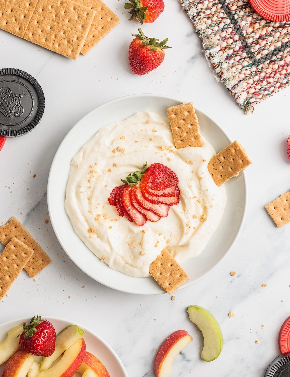 Once you're ready to serve, arrange your dip in a bowl in the center of a platter and surround your dip with all your dippers. Back away slowly, because this dip is about to be devoured.