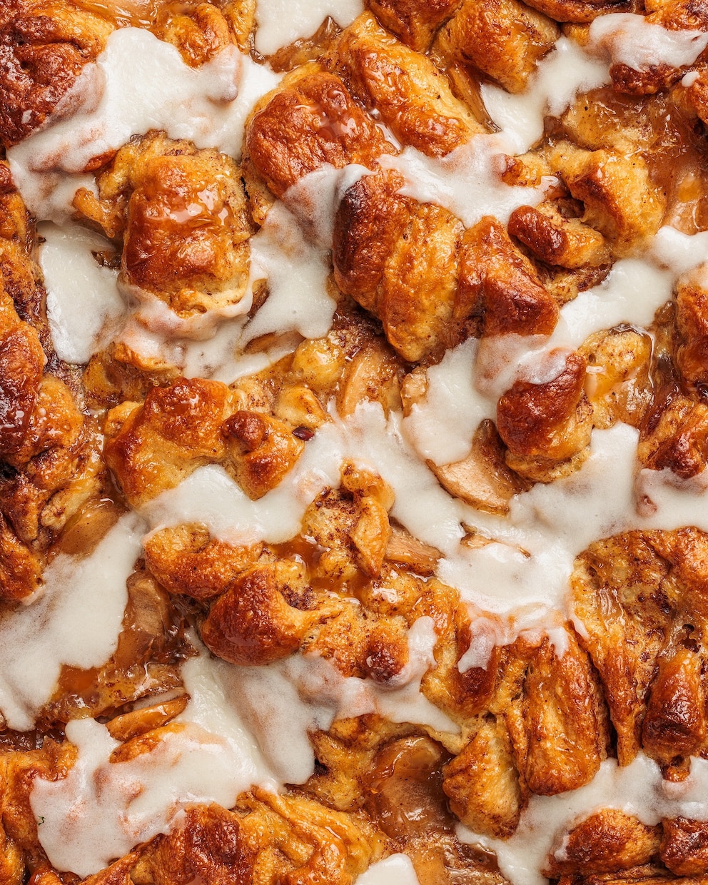 Once your casserole is done baking, remove from the oven and let cool for a few minutes. Drizzle the warmed icing over the top and dig in!