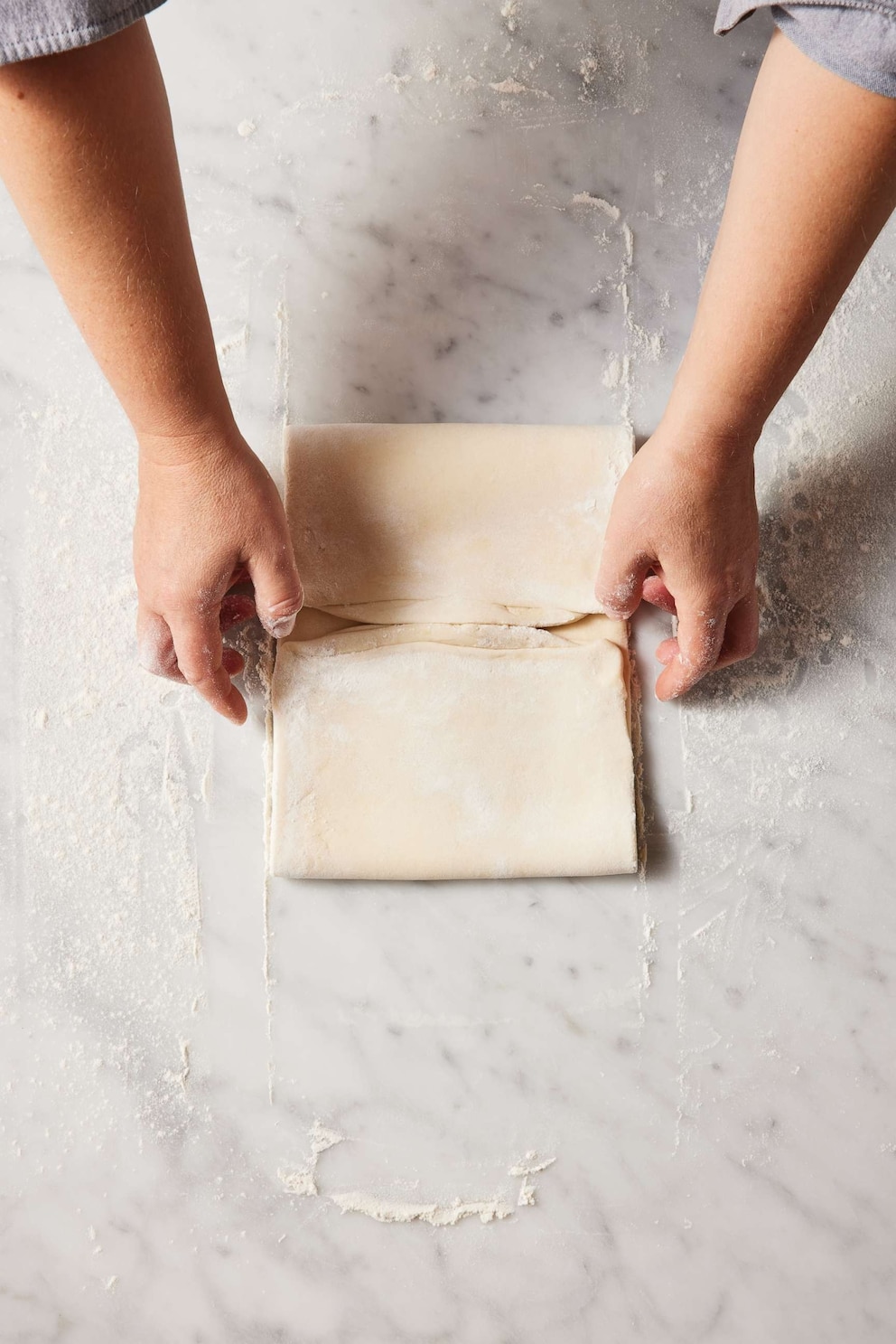 Note: The letter fold, sometimes called a single fold, is performed by folding the top third of the dough down and the bottom third up, as you'd fold a business letter. The book fold, sometimes called a double fold, has you fold both ends in to meet in the center, then fold in half from the top or bottom to make a book. Once the dough is folded, turn it 90 degrees to keep the folded edge on the left, then roll out again and perform another fold. It's important to use enough flour to keep the dough from sticking, which can result in the loss of layers. Be sure to brush that flour away with each step so that raw flour is never folded into the turns.