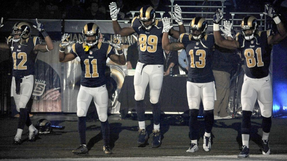 From left, St. Louis Rams players Stedman Bailey, Tavon Austin, Jared Cook, Chris Givens and Kenny Britt raise their arms in awareness of the events in Ferguson, Mo., as they walk onto the field during introductions before an NFL football game against the Oakland Raiders in St. Louis, Nov. 30, 2014.