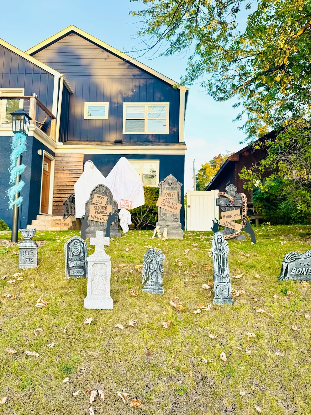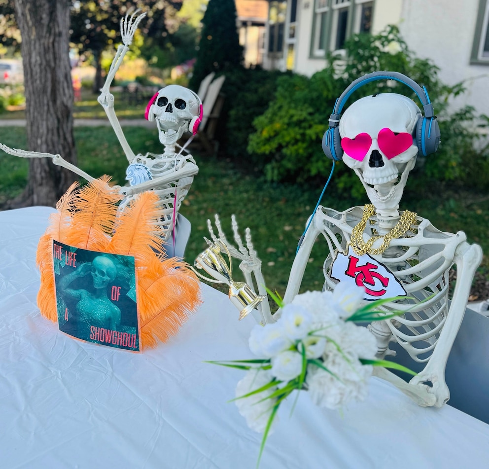 Miranda Soukup's lawn is decked out with a giant skeleton dressed as "Showgirl" era Swift, standing on a stage with a paparazzi skeleton snapping photos nearby, while Jason Kelce and Travis Kelce skeletons watch on from a "New Frights" podcast table. Close by is a graveyard of headstones of "ghosts" from Swift's past, including Scooter Braun and Kanye West.