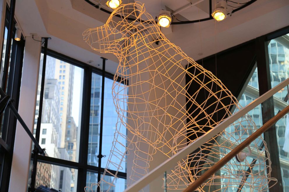 You can see one large piece of art without even having to step foot inside the door, a giant wire dog sculpture hangs from the rafters facing Park Avenue and can be seen through the glass exterior while you're walking by on the street. The sculpture, like the Empire State Building, will light up different colors for different events and holidays.
