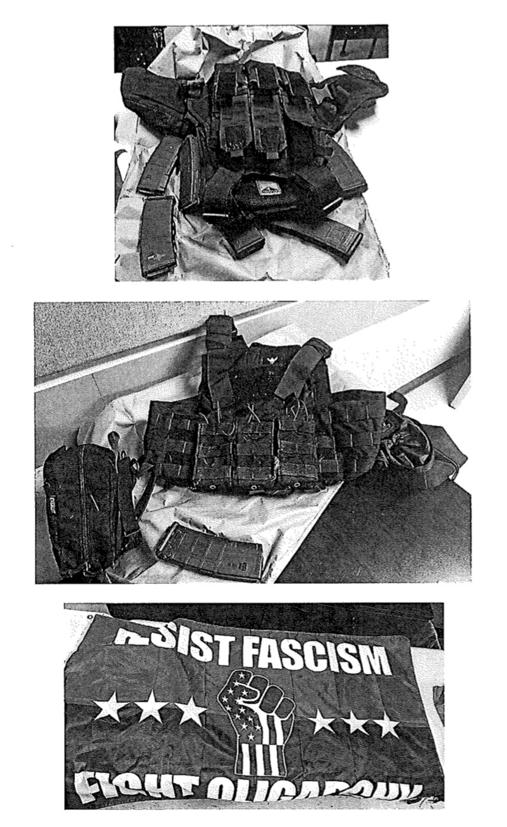 Law enforcement found 12 sets of body armor, spray paint, a flag saying "resist fascism, fight oligarchy," flyers saying "fight ice terror with class war free all political prisoners," more fireworks, weapons and cell phones across multiple searches over the weekend.