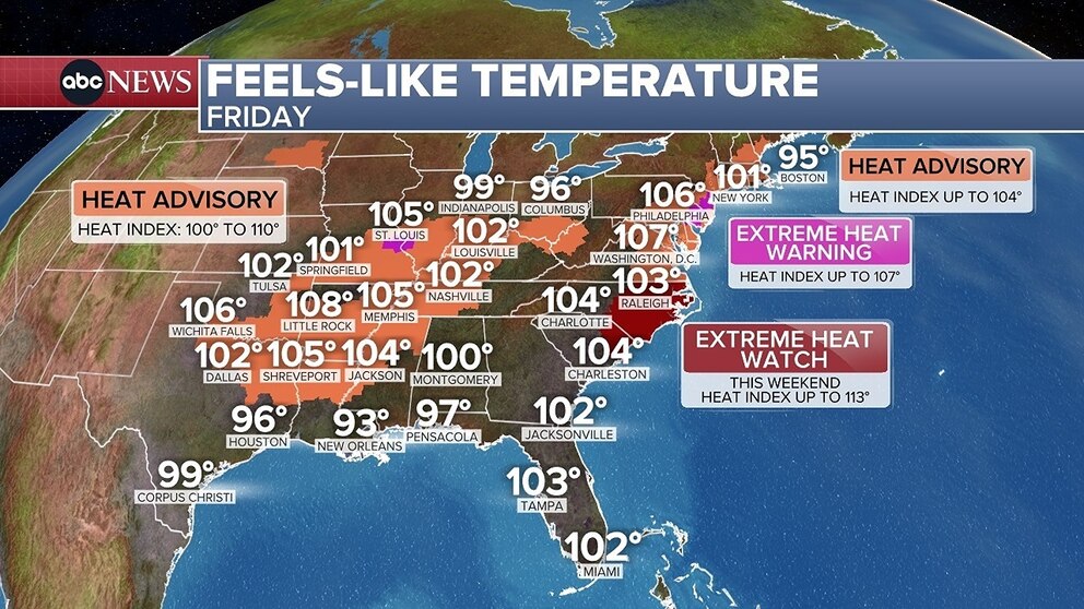 At least 100 million Americans are on alert for dangerous heat and humidity -- stretching from Texas to Maine -- on Friday, with parts of the Eastern Seaboard feeling like it's in the triple digits.