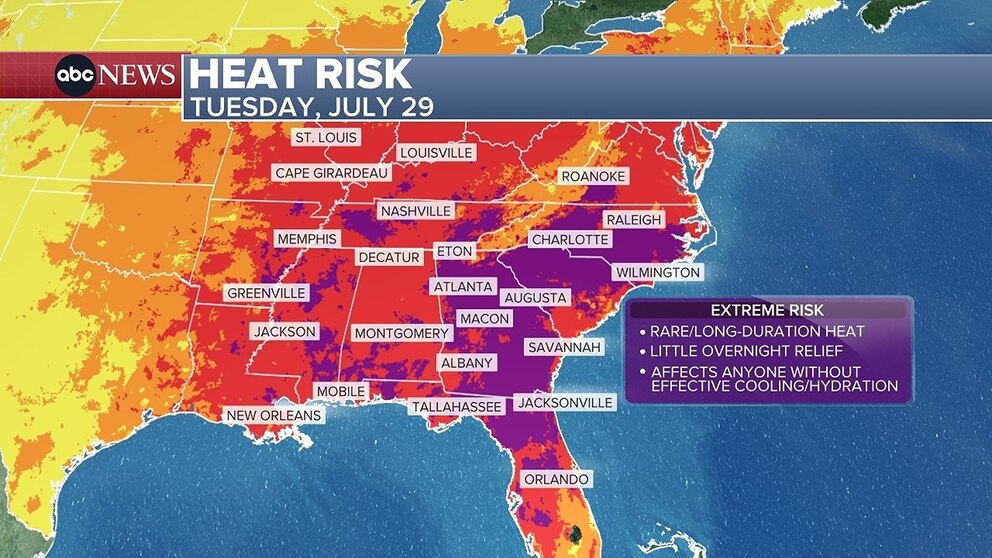 An extreme heat risk is in place from Sunday through Thursday for large portions of the Southeast.