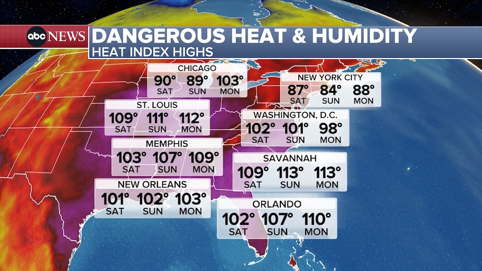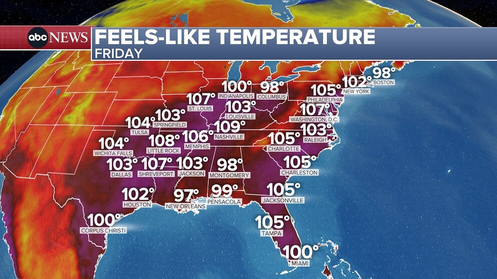 New York City, Boston and Philadelphia are also bracing for extreme temperatures. On Friday, the feels-like temperature is expected to be reach 104 in New York City, 103 in Boston, 106 in Philadelphia and 109 in Washington, D.C., and Baltimore.