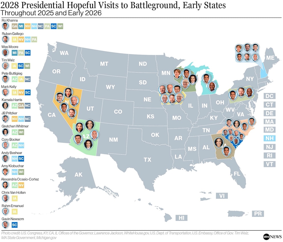 Separately, ABC News has tracked at least 43 visits or planned visits so far in 2025 and 2026 by Democratic presidential hopefuls to key early or battleground presidential election states. Some of those states are also expected to be key House battlegrounds in 2026.
