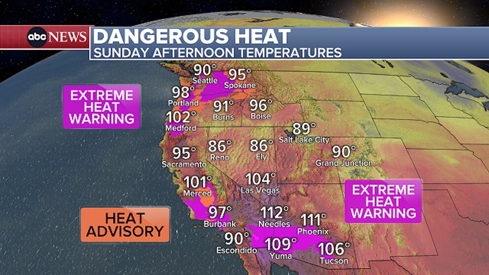 An extreme heat warning is in effect on Sunday for cities including Seattle, Wash.; Portland, Ore.; Los Angeles, Calif.; Las Vegas, Nev.; and Phoenix, Ariz.