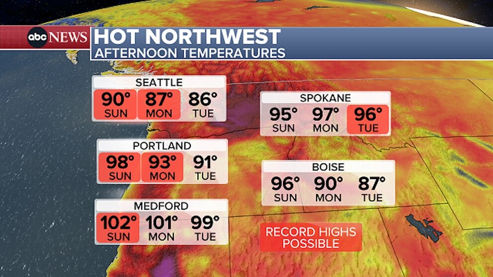 Highs will be near 90 in Seattle on Sunday afternoon and the temperature is expected to soar into the upper 90s in Portland, with daily record highs challenged in both cities through Monday.
