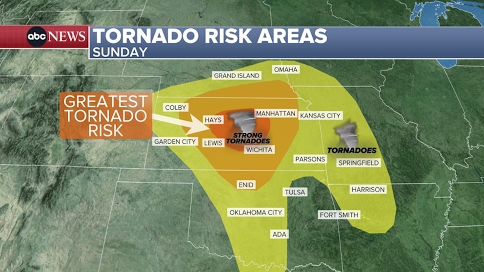 The greatest tornado potential is centered on Sunday over Kansas, where strong storms are expected to begin firing off around noon local time on Sunday, ahead of the severe weather developing later in the afternoon.