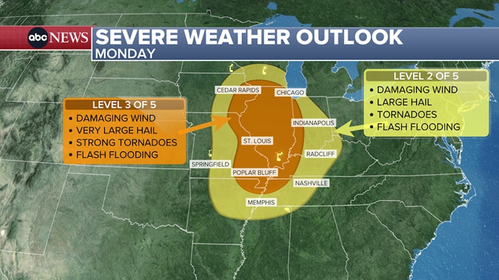 On Monday, the severe weather threat spreads northeast and stretches from the lower Mississippi River Valley up to the Midwest. A level 3 out of 5 "enhanced risk" of severe weather is expected on Monday for multiple cities, including St. Louis, Mo., Cedar Rapids, Iowa; Jonesboro, Ark., Evansville, Ind., Paducah, Ky., and Rockford, Ill.
