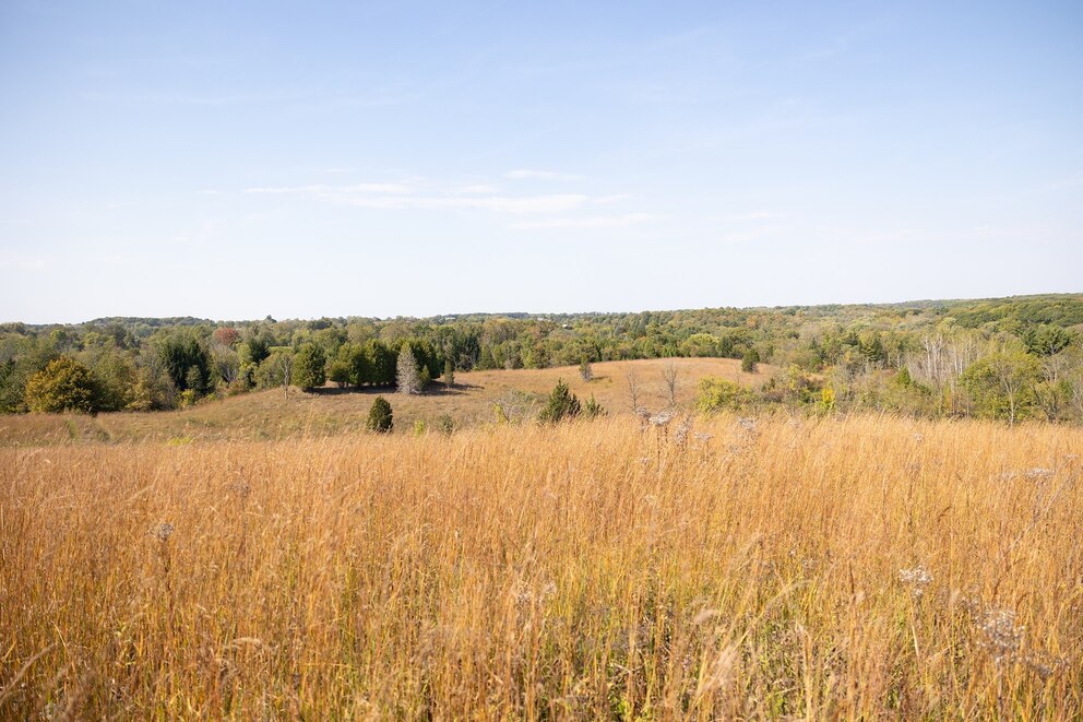From outside Uttech's home art studio, the landscape is filled with rolling hills, topped with wildflowers that build to the highest point in the township, where rows of evergreens that Uttech says he planted by hand in 1988 have since grown into mature trees.