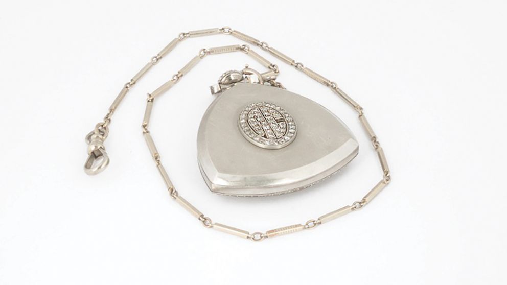 According to the auction house, the rounded triangular pocket watch was personally owned and used by Capone. The timepiece is on its original chain made of 14-karat white gold. The exterior of the case features 23 diamonds shaped to form Capone's initials, "AC," which are encircled by 26 additional diamonds. Another 72 diamonds circle the watch's platinum face and gold-tone impressed numerals.