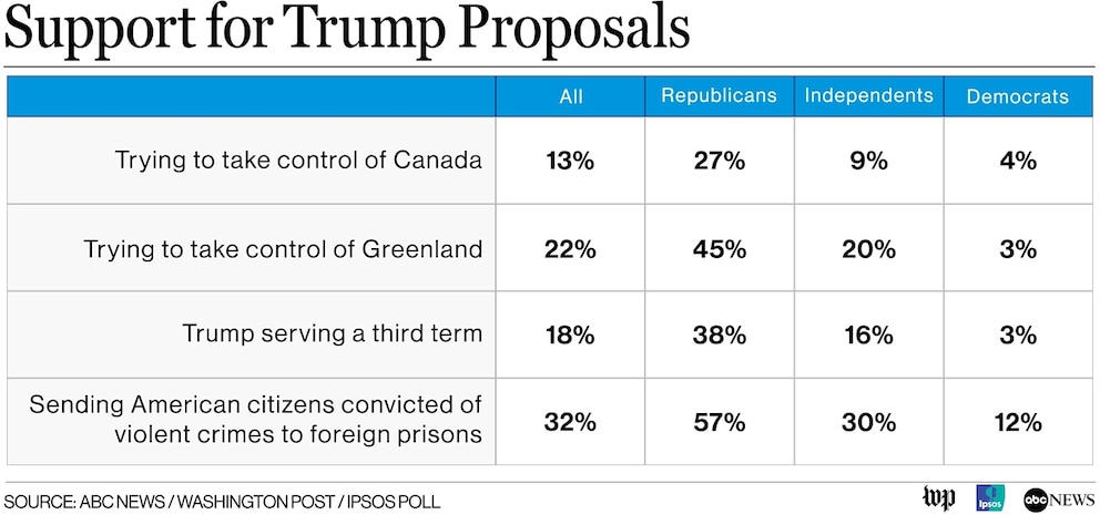 About 7 in 10 adults in this ABC News/Washington Post/Ipsos poll think Trump is serious when he talks about sending American citizens who are convicted of violent crimes to prisons in other countries (71%) and the United States trying to take control of Greenland (68%).