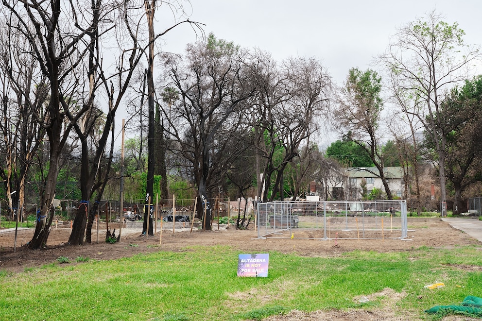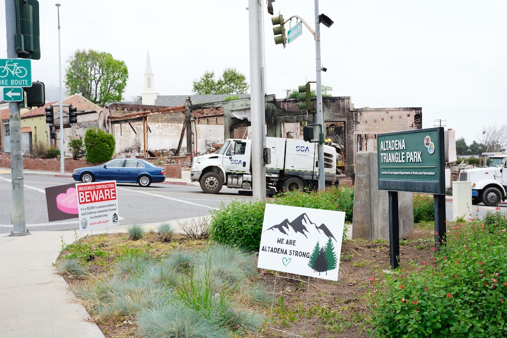 As a procession of construction trucks drives through the blackened streets of Los Angeles County's Altadena neighborhood, the first signs of natural regrowth can be seen in sidewalk planters.