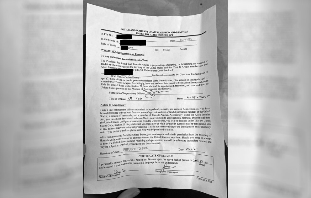 The document, titled "Notice and Warrant of Apprehension and Removal under the Alien Enemies Act," says, "You have been determined to be ... a member of Tren de Aragua."
