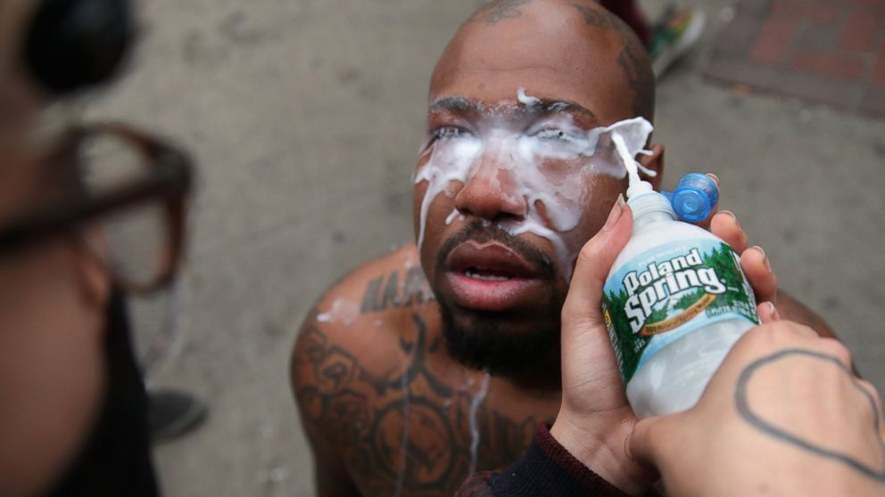 — -- The man in this picture had his eyes washed out with what looks like milk in a Poland Springs bottle after being pepper sprayed by the Baltimore Police during violent protests in Baltimore on Monday.