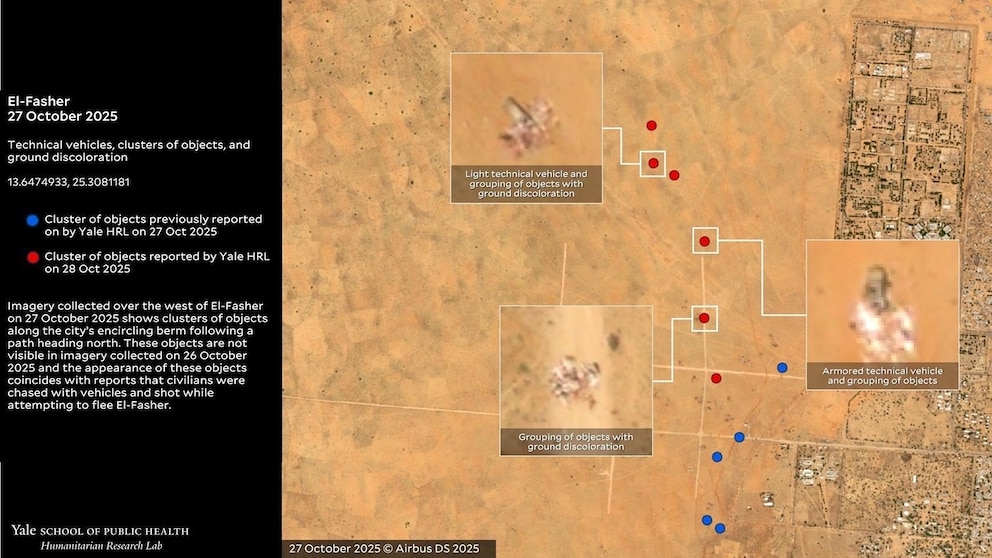 On the outskirts of El Fasher, HRL Yale also said they observed multiple clusters appearing between Oct. 26 and Oct. 27, consistent with reports of civilians being killed as they tried to flee. West of the city, along its encircling berm, at least six clusters were observed as well as adjacent technical vehicles, which were not seen in images from Oct. 28, suggesting RSF had moved, leaving the large clusters of bodies behind, according to the research lab.