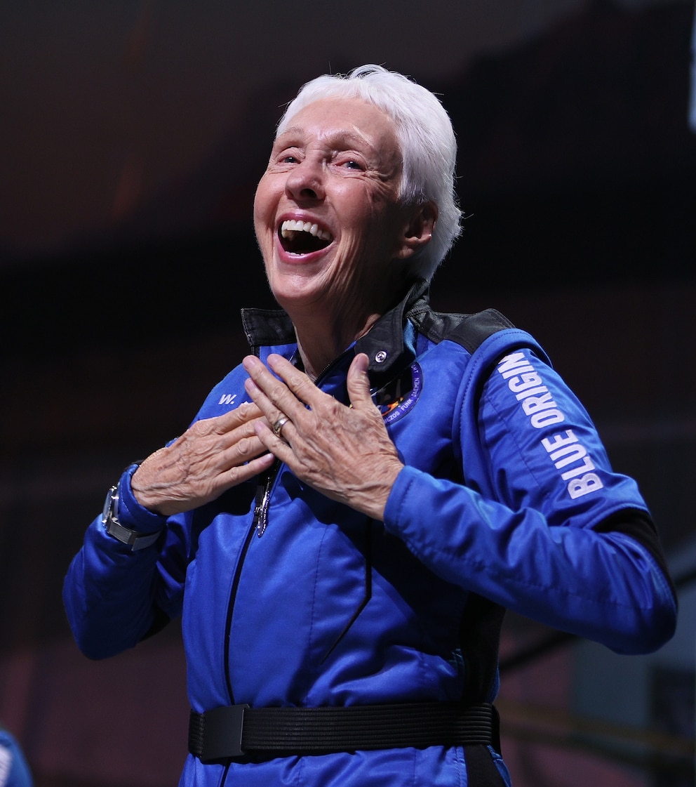 Wally Funk, a pioneering female aviator and former military jet test pilot who in the 1960s endured the grueling training astronaut training as part of a privately funded Woman in Space Program that later became known as the "Mercury 13" project due to its 13 women participants. Funk, however, was never allowed the chance to go to space until she joined Bezos on the 2021 Blue Origin maiden flight and became, at age 82, the oldest female to travel into space.