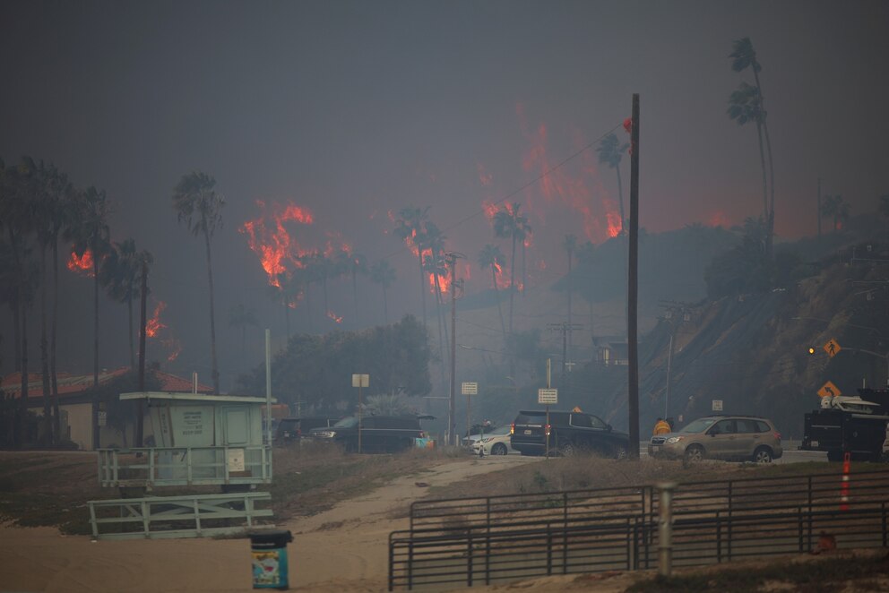 From the mountains to the coast, huge swaths of smoke and flames rose from the area as fire crews battled the wind-driven blaze. By Tuesday evening, the brush fire had jumped the Pacific Coast Highway, nearly reaching Will Rogers Beach State Park.