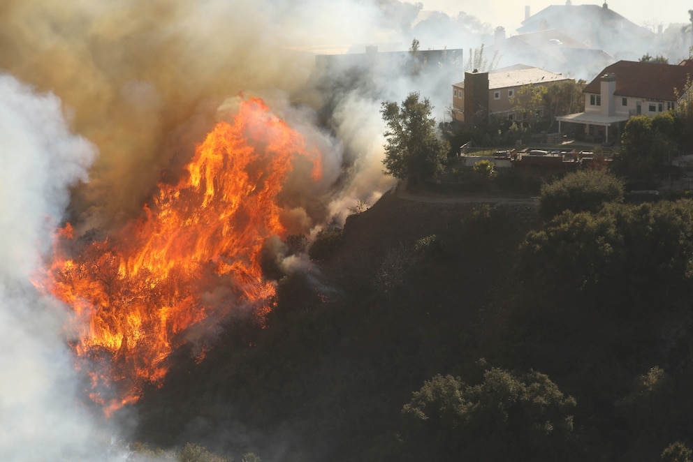 A fast-moving brush fire that erupted Tuesday in Los Angeles threatened homes and sent thousands of residents fleeing, prompting city and state officials to declare a state of emergency.