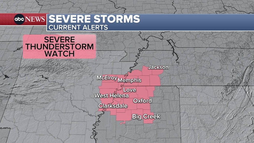 In addition, parts of eastern Arkansas, northern Mississippi and western Tennessee remained under a severe thunderstorm watch until 1 a.m. CT, with scattered damaging wind gusts to 70 mph possible -- and even a tornado or two.