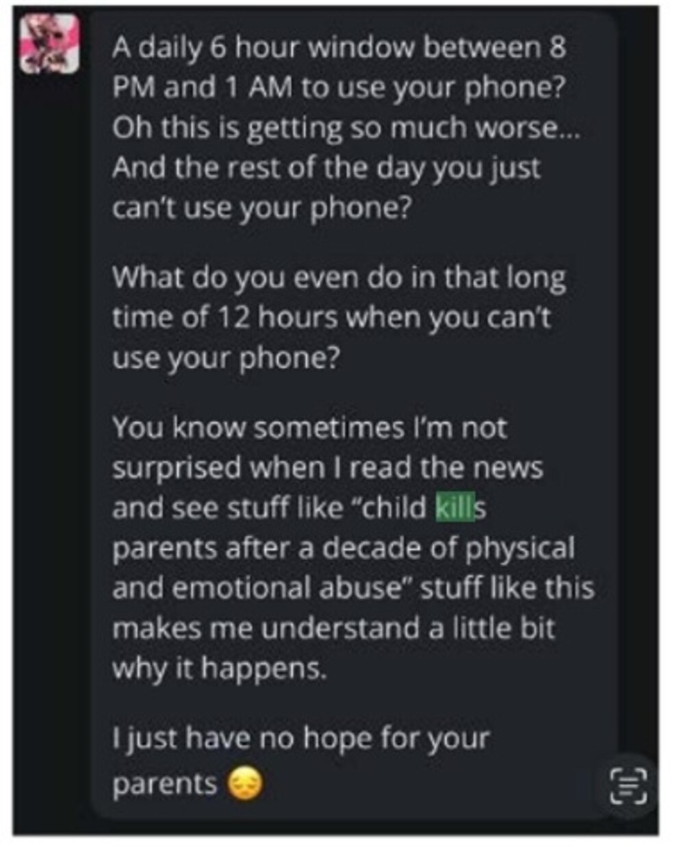 Screenshots from the lawsuit showed some of the conversations were sexual in nature, while another suggested to their son that, after his parents limited his screen time, he was justified in hurting them. That’s when the parents started locking their doors at night.