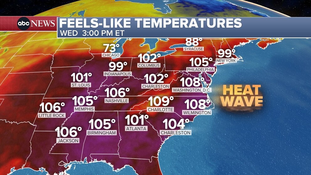 The heat index -- what temperature it feels like with humidity -- is forecast to reach 99 degrees in New York City, 105 in Philadelphia, 108 in D.C. and Wilmington, 104 in Charleston, South Carolina, and 106 in Nashville, Tennessee.