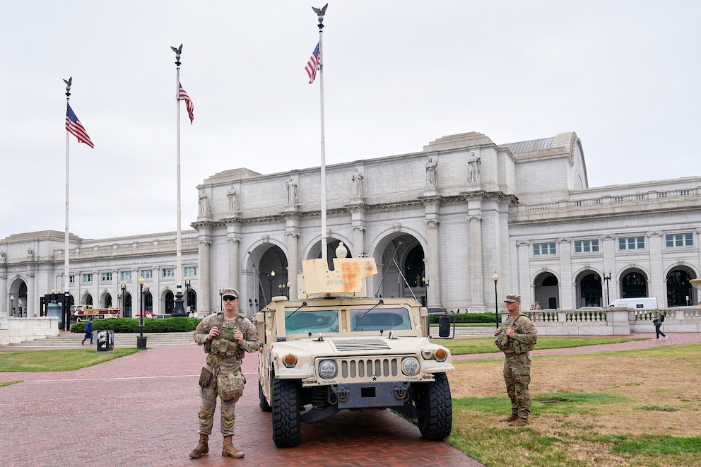 Working in shifts, Guard troops began deploying last week in small numbers at popular tourist spots like the Washington Monument along the National Mall, where crime is relatively low. Standing alongside armored Humvees, the unarmed soldiers and airman could be seen posing for pictures with tourists and talking with children.