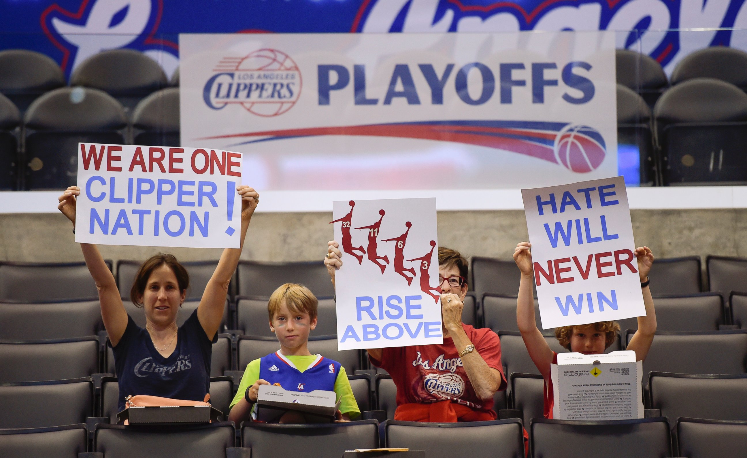 April 30, 2014— -- Basketball fans often bring homemade signs to games, showing their support with markers and construction paper. But the signs at Staples Center in Los Angeles for Tuesday’s Clippers-Warriors playoff game took an urgent, resolute tone.