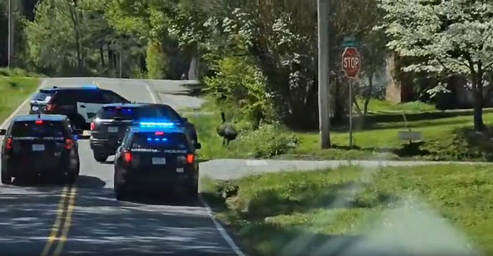 McDaniel took out his phone to film and post a video of four police cruisers slowly driving behind the emu to capture the bird. The chase ended when the officers cornered MeeMoo near a local home surrounded by hedges. McKinney was enlisted to end the pursuit, calling his pet emu back to safety.